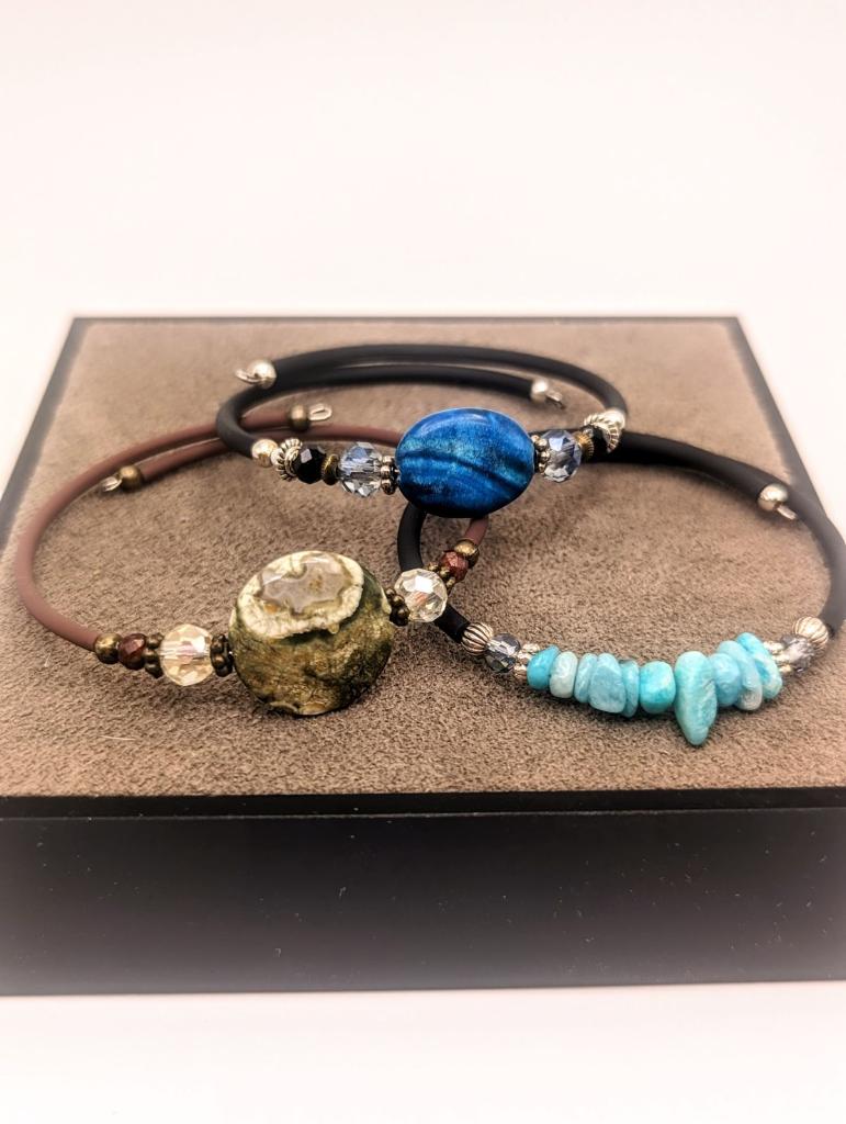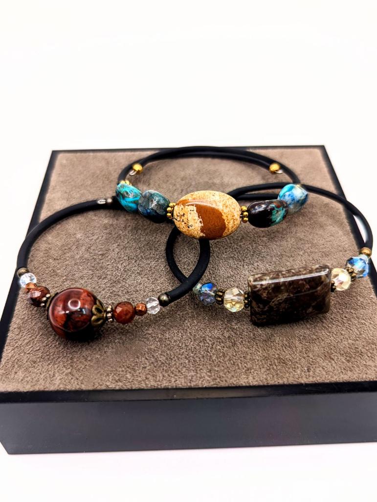 Unique ornamental stones in adjustable bracelets and earrings. One of our best sellers, they're easy to stack or gift!