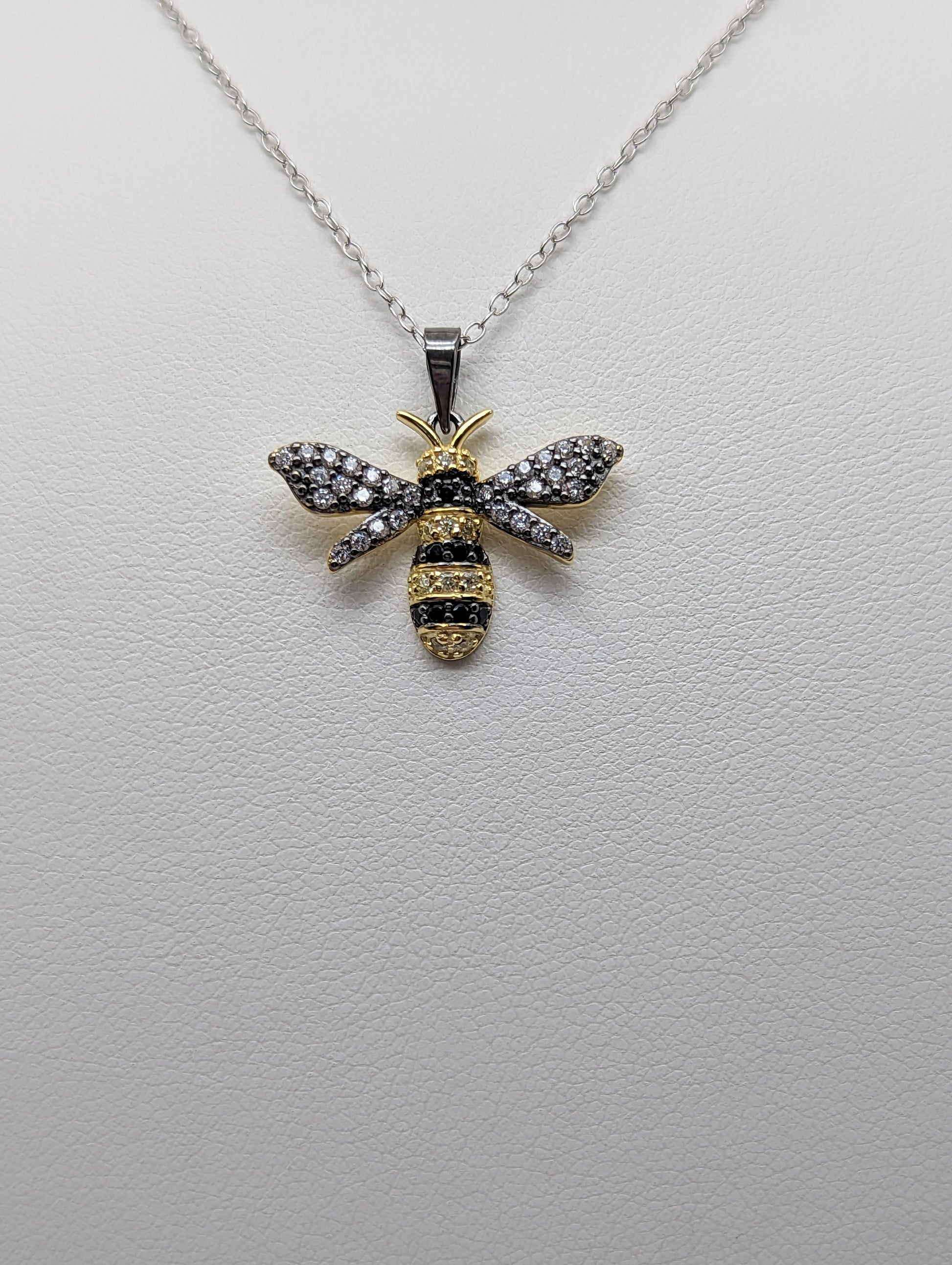 Charming sterling silver bee pendant, intricately adorned with shimmering colored crystals. A whimsical piece that beautifully captures the essence of nature's wonder.
