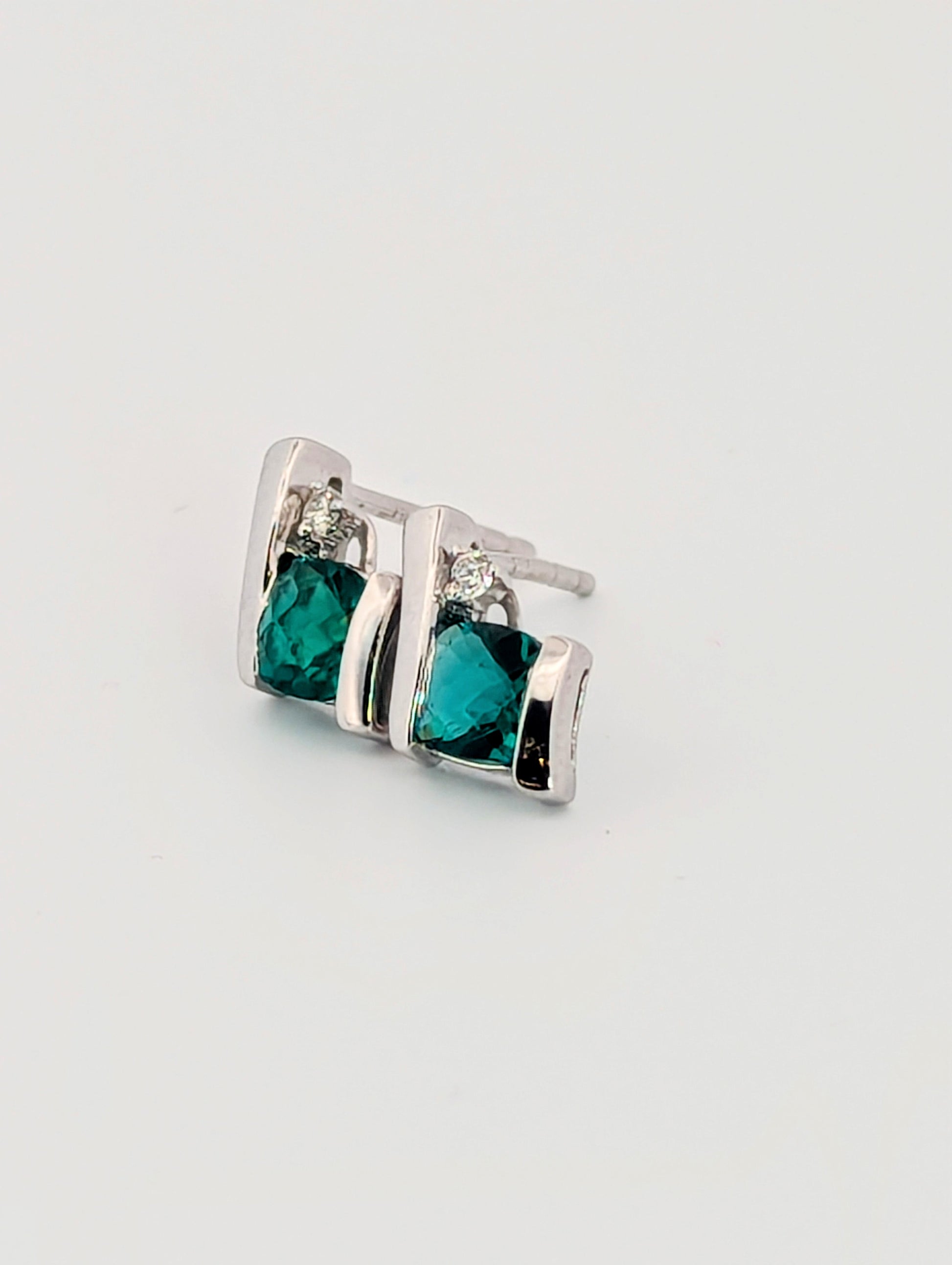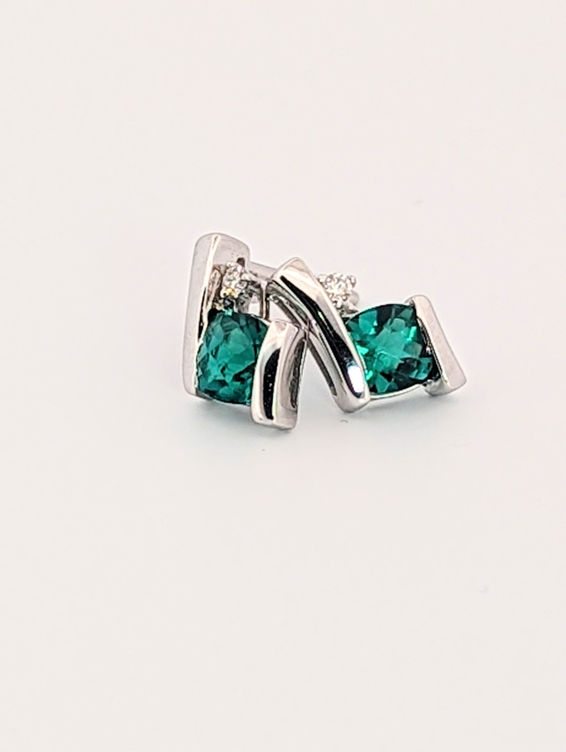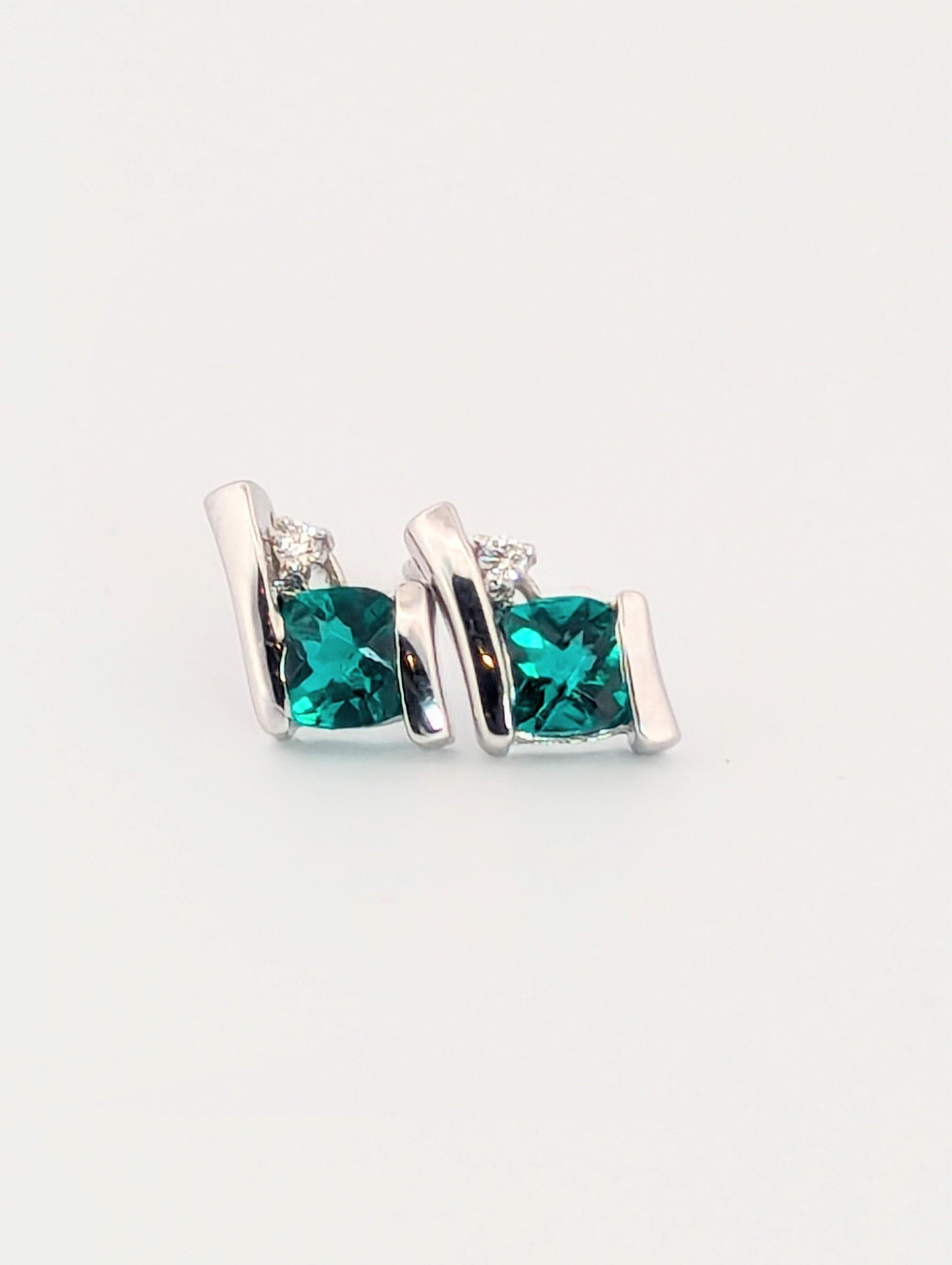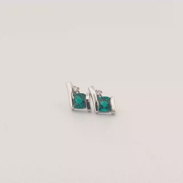 Cut in a dazzling checkerboard pattern, each of theses lab created emerald earrings are accented with one round brilliant cut diamond, all set in a free form 10K white gold setting.