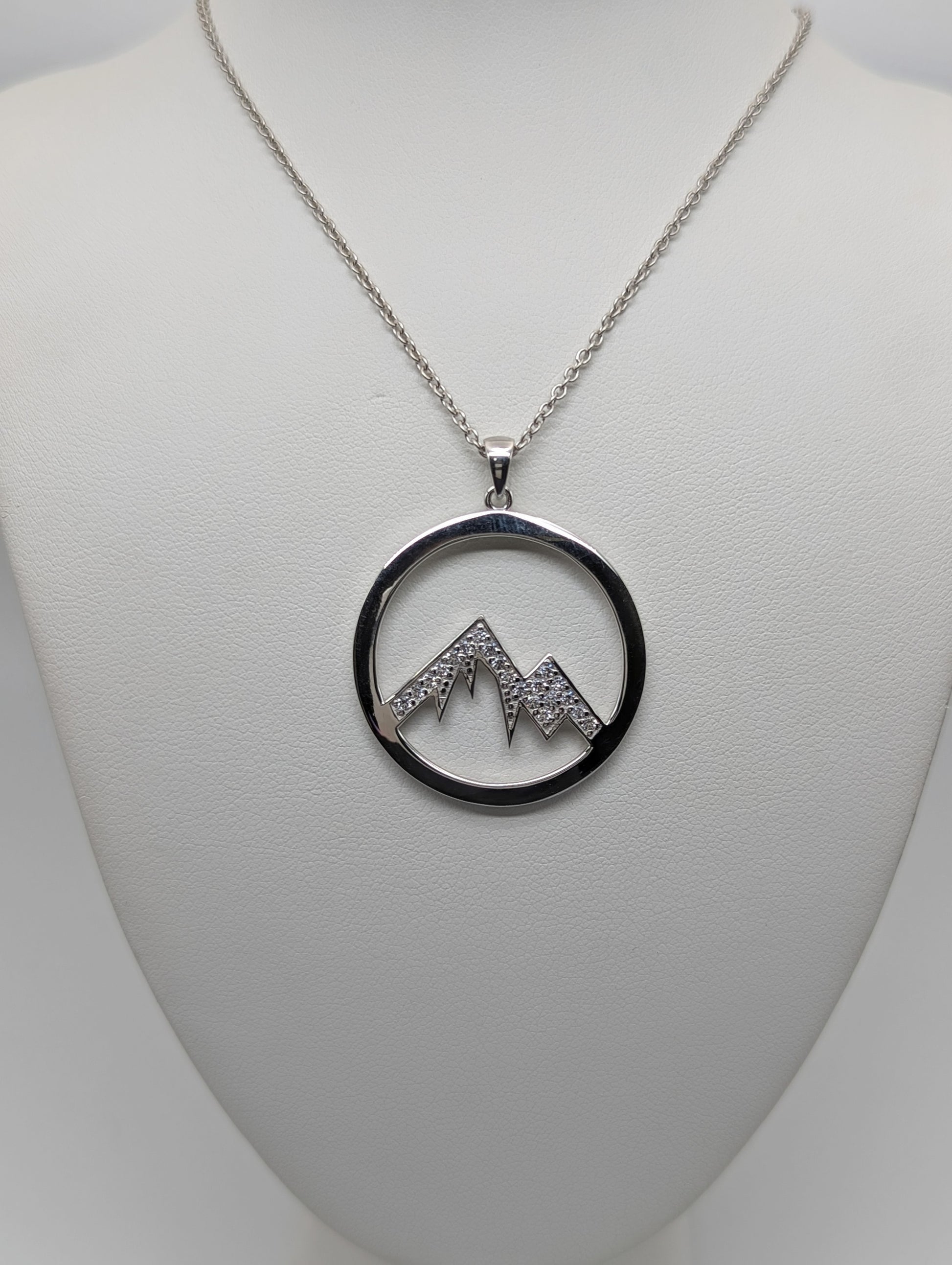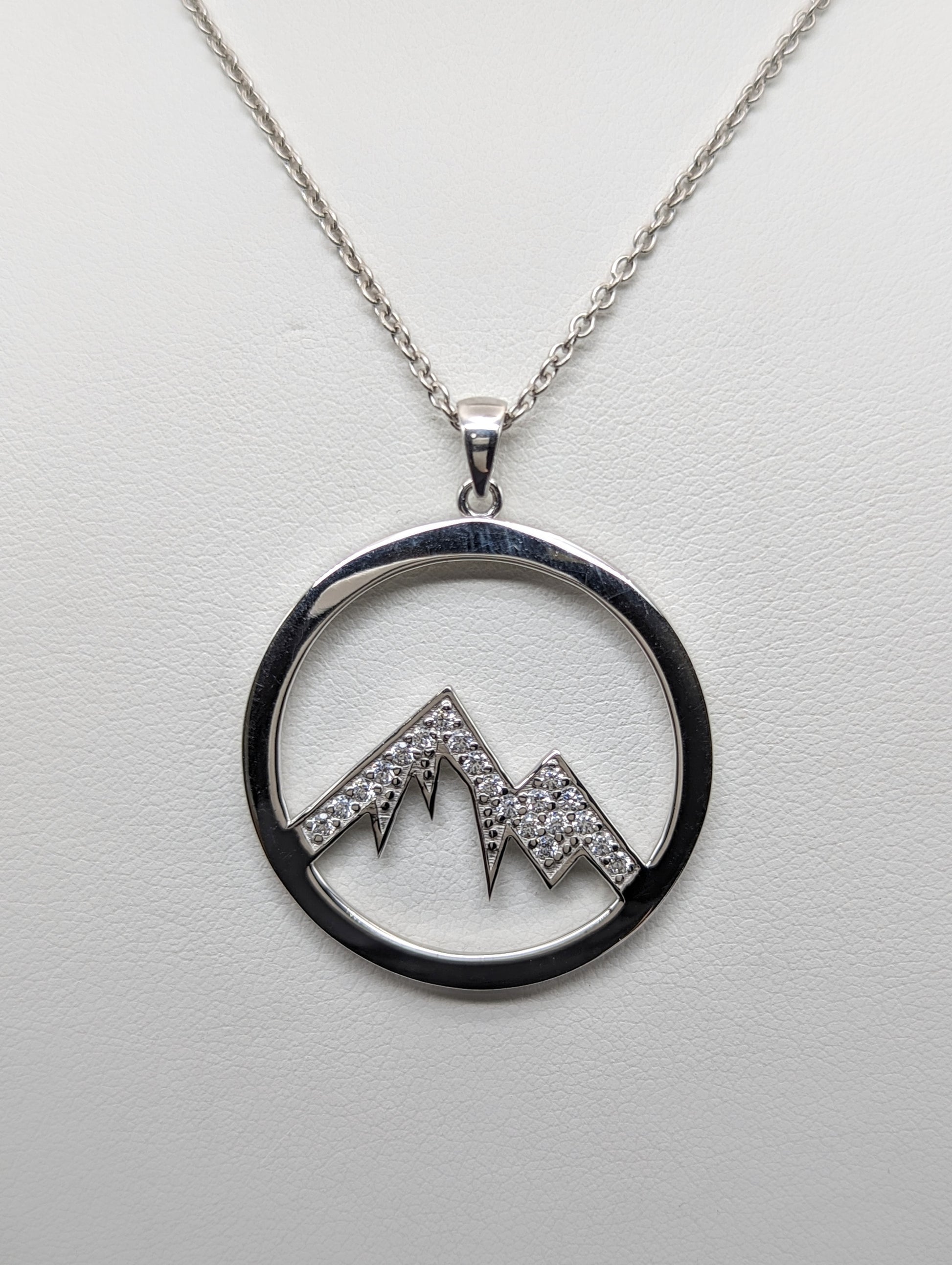 Elegant round pendant featuring a two-peak mountain silhouette, gracefully accentuated with sparkling crystals. A symbol of strength and beauty, this piece is a tribute to nature's grandeur.
