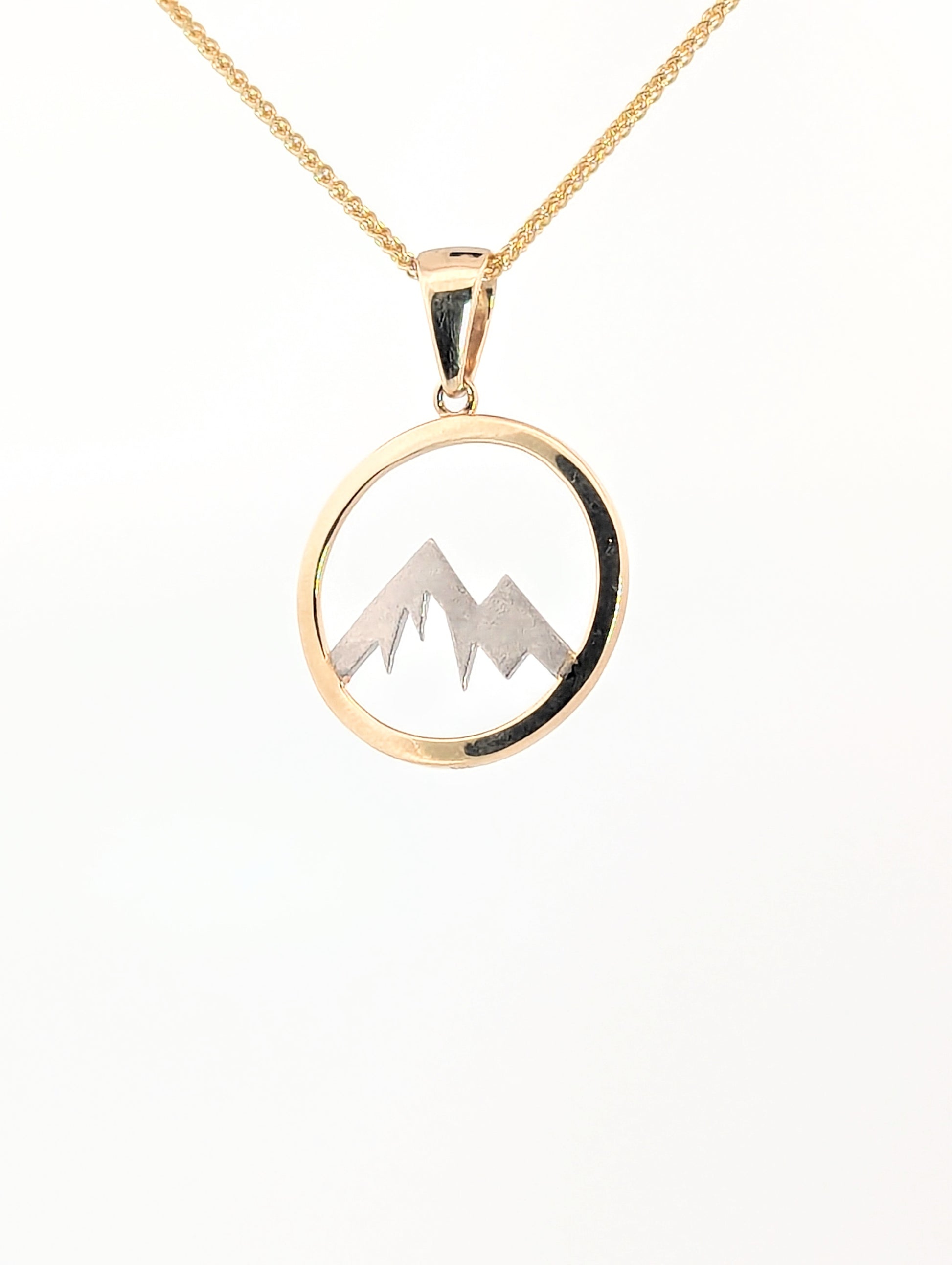 This beautiful mountain scape silhouette elegantly hangs serving as a reminder of the simple beauty of the outdoors. The circular 14 karat yellow gold frame conveys a sense of warmth, highlighting the striking landscape of the mountains as they suspend in white gold against their scenery.