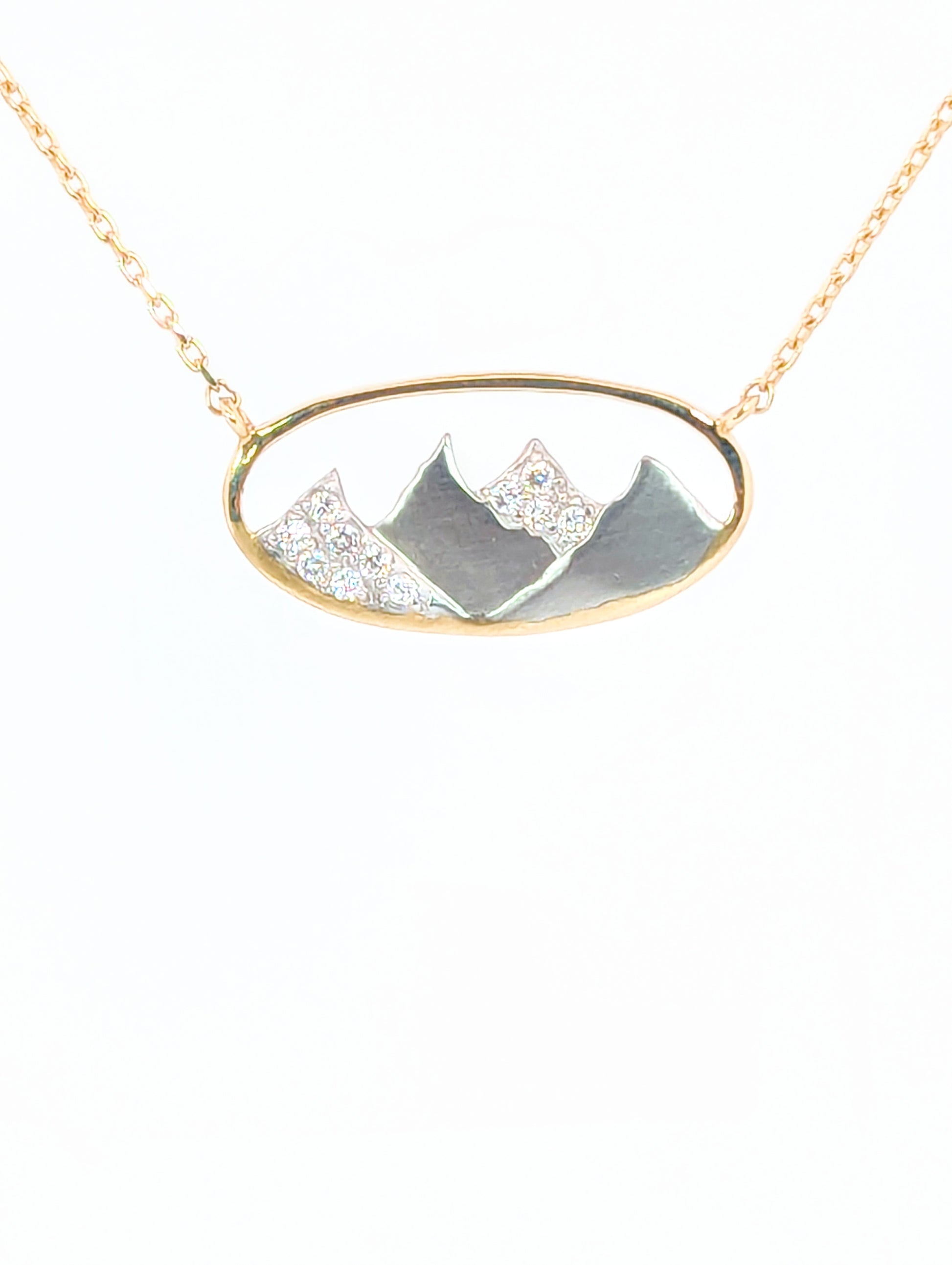 Created by a local artist in Colorado, the striking white gold peaks shimmer as they alternate between diamond accents and a sleek finish. Set on a 20" gold chain, and encased in a 14 karat gold oval, these peaks will make sure you never forget your connection to the mountains.